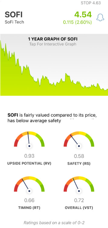 VectorVest advocates buying safe, undervalued stocks, rising in price. As for SOFI, it is undervalued with fair upside potential, but it has poor safety and timing.