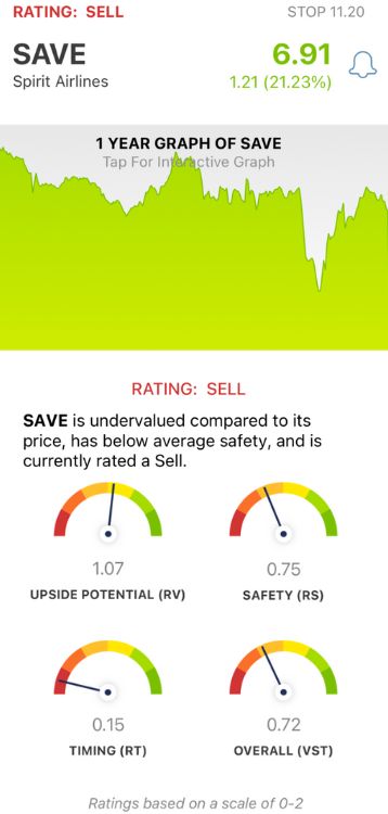 Each rating sits on its own scale of 0.00-2.00 with 1.00 being the average. This makes interpretation quick and easy. To make things even easier, though, you’re given a clear buy, sell, or hold recommendation based on the overall VST rating for any given stock at any given time. As for SAVE, here’s what you need to know: