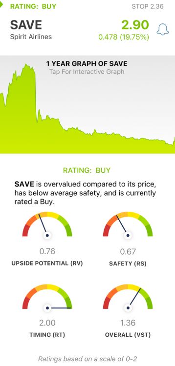 VectorVest advocates buying safe, undervalued stocks, rising in price. SAVE has started to find its footing, up 36% in the past week on another merger rumor. The stock may have poor upside potential and safety, but excellent timing makes it a BUY today.