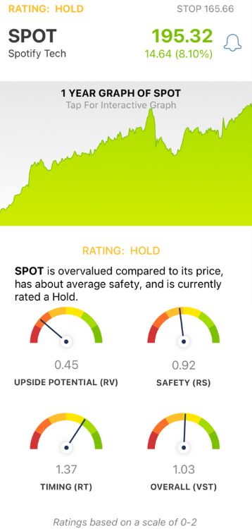 Each rating sits on an easy-to-interpret scale of 0.00-2.00, with 1.00 being the average. You’re then given a clear buy, sell, or hold recommendation based on the overall VST rating for any given stock at any given time. Here’s the current situation for SPOT: