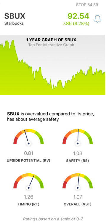- Fair Safety: an indicator of risk, the RS rating looks at a company’s financial consistency and predictability, debt-to-equity ratio, and business longevity. As for SBUX, the RS rating of 1.03 is slightly above the average and is considered fair.
