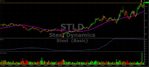 STLD is currently trading above the standard 40- and 200-day moving averages, which is a positive sign for the future trend. Furthermore, it has driven above its short-term 10- and 20-day moving averages over the last five days as its uptrend has accelerated. Breaking above the December high should propel it higher because there will be no overbought resistance. STLD is ranked third out of 17 stocks in its industry by the VectorVest VST rating, and sixth in its business sector (22 stocks). The average daily trading volume is 2.5 million shares, making it very liquid for traders and investors to take advantage of a narrow bid-ask spread.