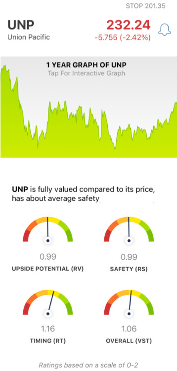 - Fair Safety: In terms of risk, UNP is a fairly safe stock - backed up by the RS rating of 0.99. This rating is calculated through an analysis of the company’s financial consistency & predictability, debt-to-equity ratio, and business longevity.