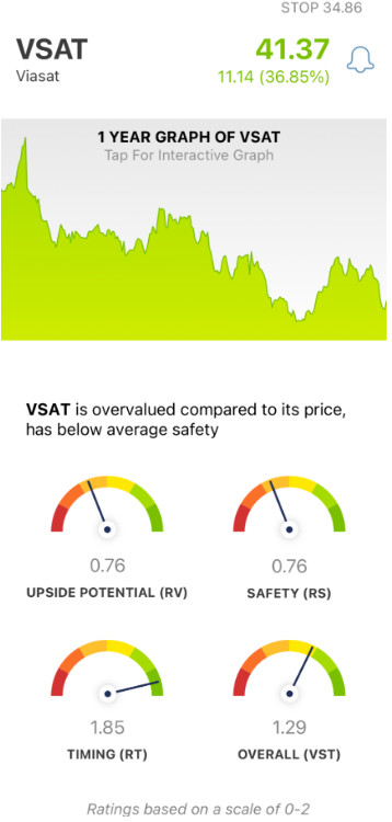 - Poor Upside Potential: The RV rating takes into account the long-term price appreciation potential a stock has – projected up to three years out. And, the RV rating of 0.76 for VSAT is poor, despite the prospect of what this deal could mean for them. Moreover, VectorVest calculates the company’s current value to be lower than what it’s trading right now – at $30 compared to a share price of $40