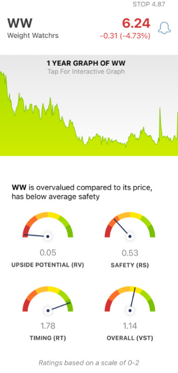 The overall VST rating for WW is good at 1.14. So, is this stock worth adding to your portfolio if you don’t already have a stake in it? Does excellent timing outweigh very poor upside potential and poor safety, or is it the other way around?