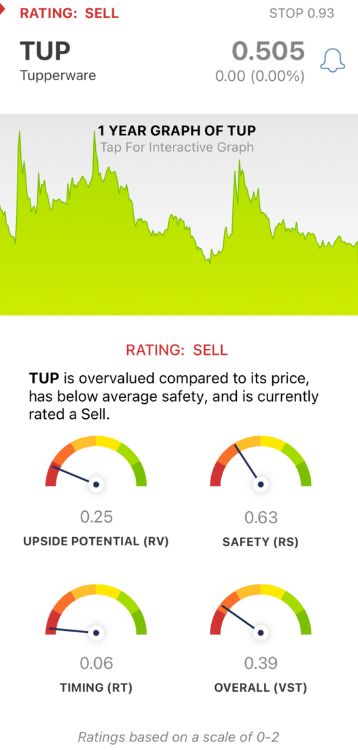 - Very Poor Timing: The RT rating is based on the direction, dynamics, and magnitude of the stock’s price movement. It’s calculated day over day, week over week, quarter over quarter, and year over year. After losing almost all remaining value, TUP has a very poor RT rating of 0.06.