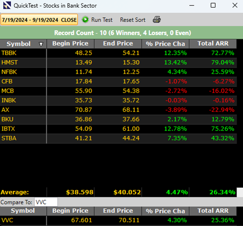 Click on the Viewers tab and select Sector Viewer. You will notice, as described above, the Sector Viewer is sorted by RT Desc. I clicked on the date box and changed the date to July 19, 2024 (this shows me the top RT Business Sectors that would have been listed on the Home Page as of that day). The top Industry was banking and I right clicked and selected View Stocks in Business Sector. Once the list of Stocks popped up, I changed the sort to RT DESC. I then QuickTested the top 10 stocks through last night’s close.