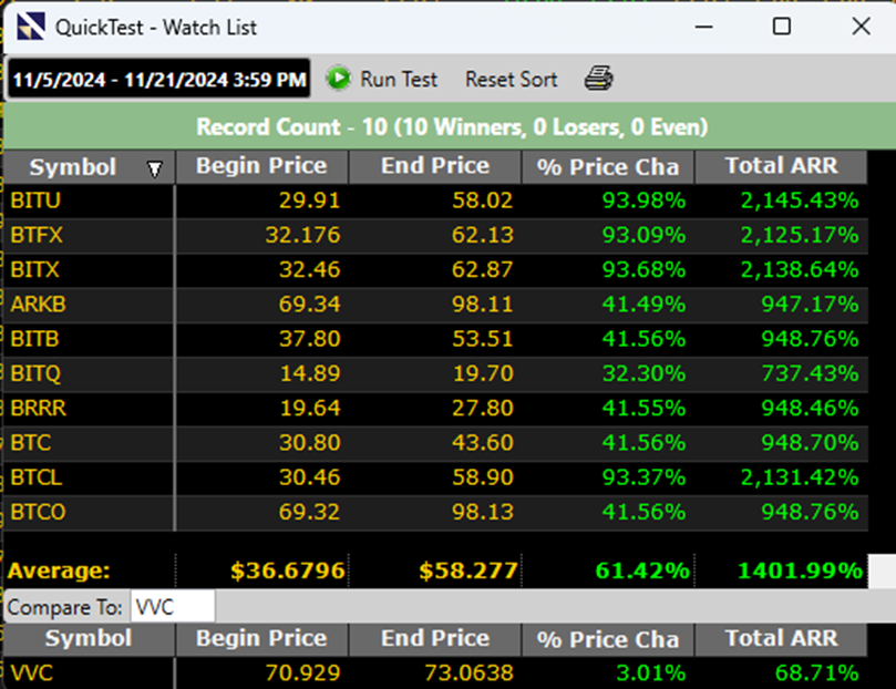 OK, not bad, but I was sure that VectorVest could help me compete with Bitcoin’s rise. Because I have been seeing articles about Bitcoin-focused ETFs soaring, I wondered how a WatchList of just crypto ETFs would fare; especially with VectorVest’s proprietary default sort to help me pick the right candidates. My colleague Michelle and I set out to find all the crypto-focused ETFs and managed to build a WatchList of 66 Crypto ETFs.** It has been added to our Special WatchLists folder for your perusal. A QuickTest of the top 10 ETFs in this WatchList sorted by VST Desc from November 5th’s close through yesterday’s close showed the following: