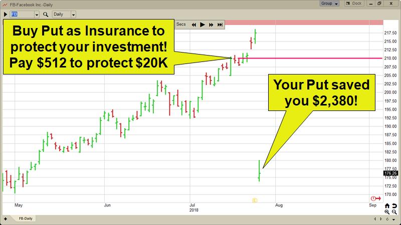 Facebook was in a strong uptrend, but it had several negative news events throughout the year. If you owned shares of FB, you might’ve been nervous prior to the earnings announcement. One week prior to earnings, you buy a Put as insurance. At the time, FB was trading at $209.36. If you owned 100 shares, you had $20,936 invested in FB and you’d want to ensure that against a major loss. Your Put cost you $512. After earnings, FB plunges to $176.26. You would have been saddled with a $3,310 loss. However, your Put had a net gain of $2,380. Instead of losing $3,310, you lost $930 because you protected yourself with a Put.
