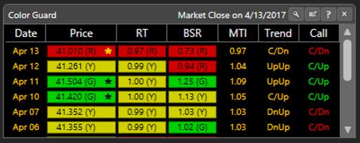 The best time to buy a put is when the market and your stock are more likely to go down or already in established down trends. If you are unsure of the trend in the market, our daily market Color Guard can help. Red Light with MTI & BSR falling – Bearish