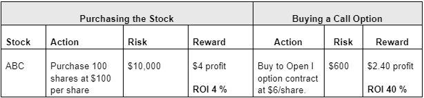 Table 1. Risk Reward Comparison. Buying to Open an option provides the Buyer with a lower risk and higher ROI than purchasing the stock.
