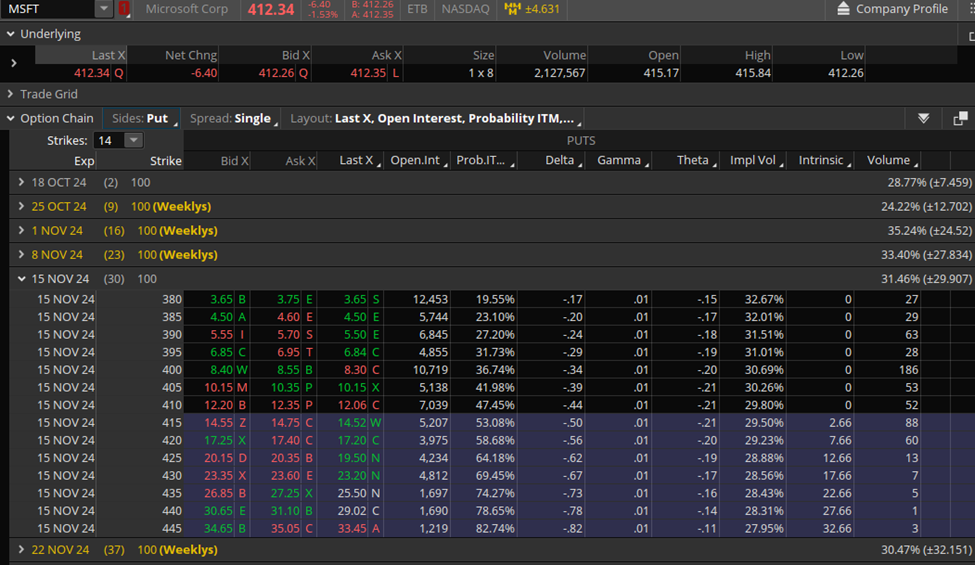 Figure 1. Option Chain for MSFT. The option chain contains essential information for selecting your strike price and expiration date for an option.