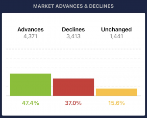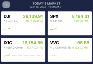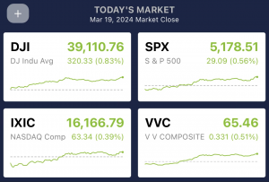 Last week closed in the red, then Monday, March 18th, started the week off in the green due to tech stocks being lifted by Nvidia and market anticipation for the Fed meeting. Tuesday, March 19th, also closed in the green, with the Dow up 320 basis points (+0.83%) and the S&P 500 up 29.09 basis points (+0.56%). The market had a mild presence of advancers to decliners, and things continued to move positively into the next day.