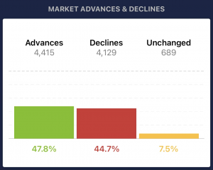 The following day, Wednesday, March 13th, the Dow closed in the green, up 37 basis points (+0.10), but the S&P 500 closed in the red, down 8 basis points (-0.19%). Advancers led decliners by a slightly larger margin than the day before but without a major shift.