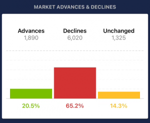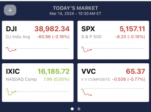 One hour into today’s trading session, Thursday, March 14th, a clear decline can be visualized through the VectorVest app, with the Dow down 60 basis points (-0.26%) and the S&P 500 down 8 basis points (-0.16%). Decliners overtook advancers by a significant margin, indicating that “sell” is the theme for the day.