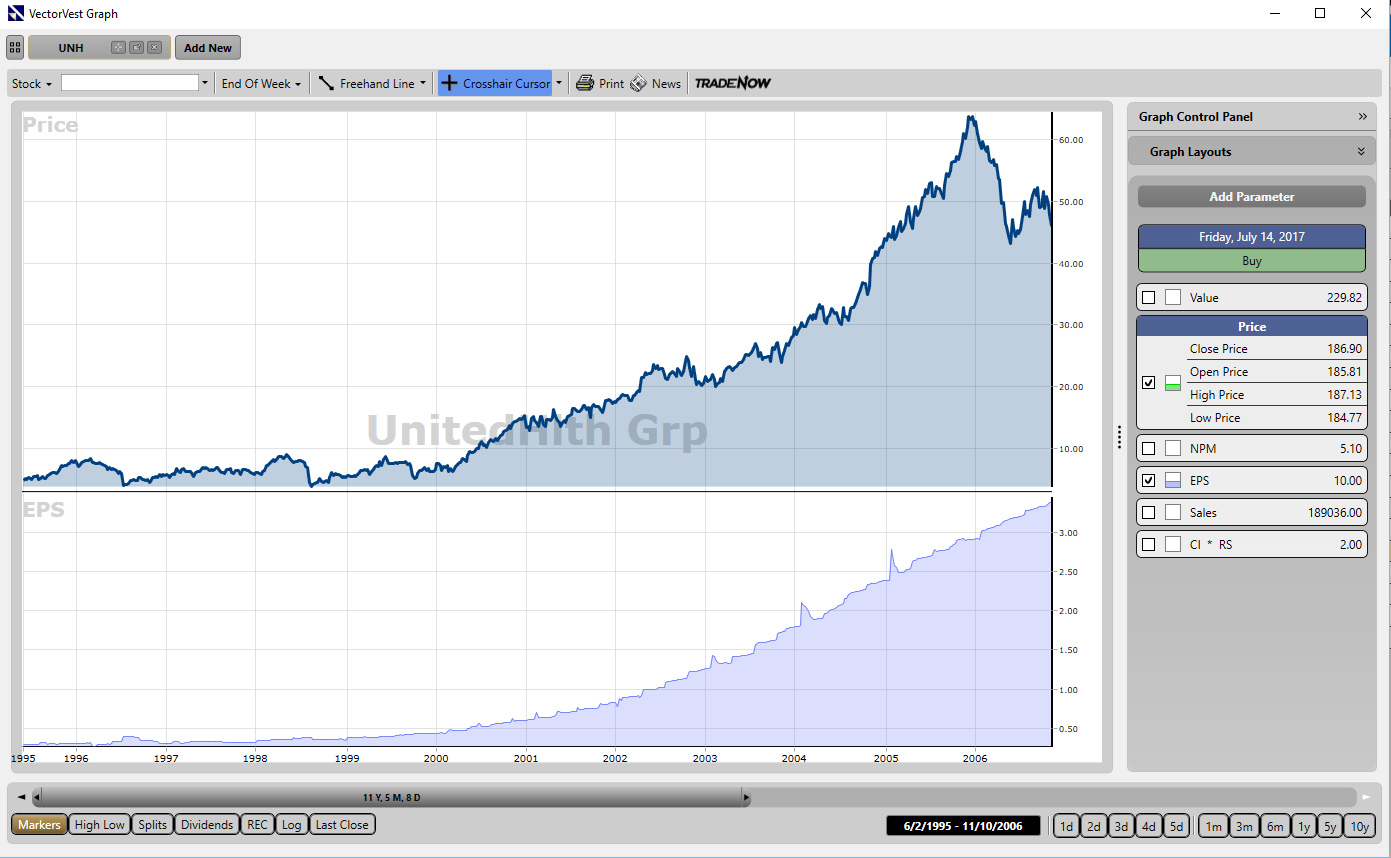 Stocks with the best EPS patterns have high RS ratings. So the next thing I do is sort by RS and look at the graphs of the top 20 RS stocks. In this case, I especially like to look at the “All Weekly” graphs to examine the long-term of earnings performance of these great stocks. EPS is the engine that keeps a stock’s price going higher and higher.