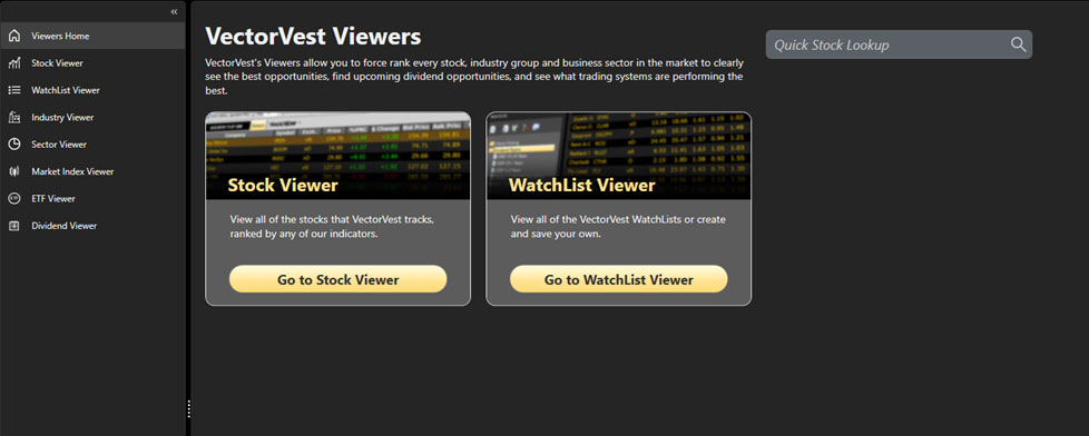 The Viewers UI Navigation has been completely redesigned to allow you to more quickly access the data you need! The Viewers Home contains shortcuts to the Stock Viewer and WatchList Viewer. It also contains a new Quick Stock Lookup to go straight to the stocks you want to see.