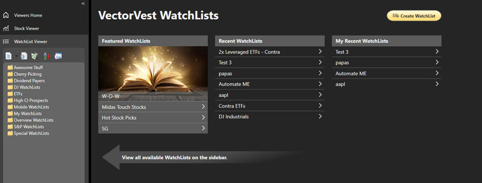 The WatchList Viewer has also been redesigned to display Featured Watchlists, Recent Watchlists, and a shortcut to Create a New Watchlist.