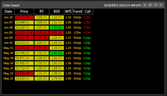 The Color Guard tracks Price; RT (Relative Timing); BSR (Buy to Sell Ratio); MTI; Trends and Calls with the red, yellow and green color indicators. You get clear Confirmed Ups and Downs to help you time the market. These directly correlate to the Market Timing Gauge. However, by seeing how Price, RT, and BSR are trending daily, you get a clearer picture of how the market is doing and why the market is trending the way it is. You won’t worry about a blip here and there. You’ll see when markets start to turn (either up or down) and you’ll also see when it’s time to sit back and enjoy the ride!