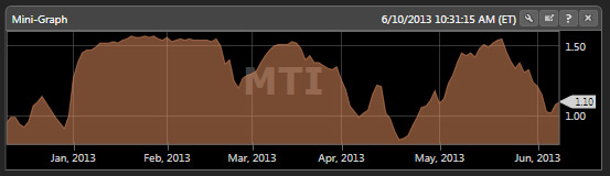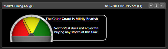 First, let’s look at the Market TIming Gauge. The Market Timing Gauge looks similar to a gauge you would find on the dashboard of your automobile. It’s divided into thirds: red on the left, yellow in the middle, and green on the right. These colors match those of the Color Guard where red indicates a Do Not Buy signal, yellow indicates a Proceed With Caution or Neutral signal, and green indicates a Buy signal. The needle will tell you where the market is, according to the VectorVest plan you have. For instance, if you have the End of Day plan, you’ll get signals from Market Close of the previous day; If you’re on the Intraday plan, you’ll get data that is delayed by 15 minutes; if you’re on the RealTime plan, you’ll get streaming data. The Market Timing Gauge will give precise instructions on what VectorVest recommends doing at that time. For instance, at the time of this post (Monday, June 10, 2013), the Color Guard is Mildly Bearish (right between the yellow and red fields), therefore VectorVest does not advocate buying stocks at this time.
