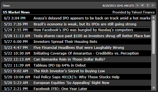Going back to the newspaper analogy, your home page can also contain a News feed. Provided by Yahoo! Finance (the default, although you can choose Reuters or Financial Times if you would rather, by following this path: Tools>Application Settings>General>News Sources>Preferred News Source), these clickable news links can give you additional insight into what is happening in the market and what factors may be affecting it.