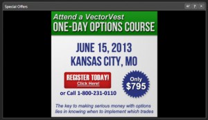 Newspapers have ads. Lots of them! If you so choose, you can populate your home page with Special Offers from VectorVest. (Don’t worry, it’s only one panel and won’t take up half the page or more like some newspaper ads!) These are great deals that we offer from time to time to help you better understand the VectorVest system and get more out of your software.