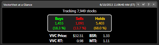 The VectorVest at a Glance graph shows the Buys, Holds and Sells of every stock VectorVest is tracking. (7,949 stocks at this time.) The Buy, Sell and Hold recommendations are based on the VVC (VectorVest Composite Index). The VVC is a mathematical formula the VectorVest system uses to evaluate stocks. You can find the actual formula here.