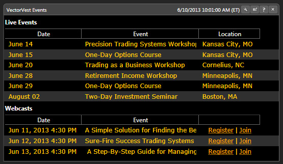 Just as newspapers have listings for events happening in your area, VectorVest has a listing of upcoming VectorVest Events that might interest you. The date, event, and location are provided. These are clickable links and take you to the corresponding page on our website where you can find out more information and sign-up, too.