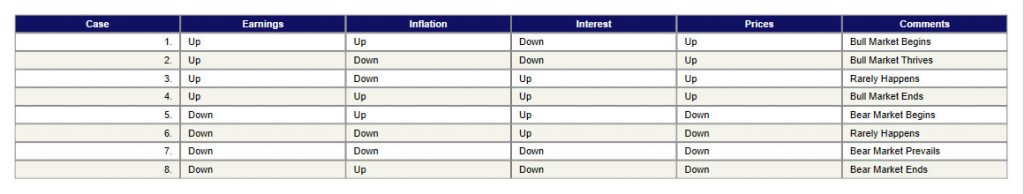 With three factors, each of which can move up or down, there are eight combinations. This array of combinations is called the “Truth Chart.” It appears as follows: