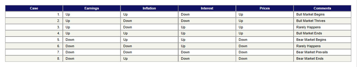 Case (5) lasted from October 2000 until January 2001 when Dr. Greenspan began lowering interest rates. The economy went into recession in March 2001, and Case (6) never happened. Once the economy weakened and earnings started to go down, Case (7) occurred again.