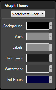 Graph Theme will allow you to select a pre-designed theme from the drop down list. There are three themes to choose from: Custom, Classic White, and VectorVest Black. VectorVest Black is the default choice. Selecting the Classic White theme will change the color scheme to a traditional white background.
